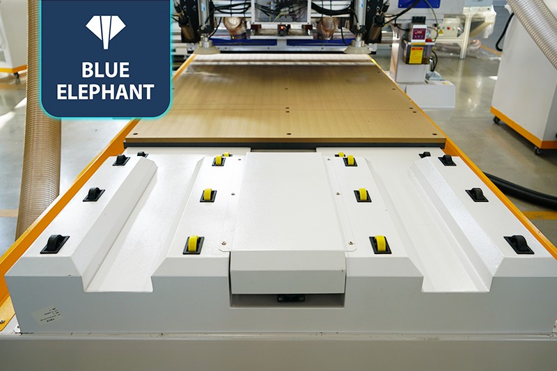 2.共兩套的9KW大功率主軸配備12位直排刀庫(每個主軸可配6把刀),高速開料,刀庫合理分配,互不干擾;