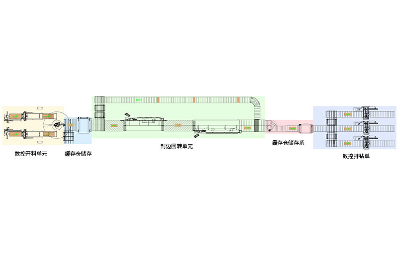 板料由動力滾筒輸送至封邊機→由第一臺封邊機完成第一條邊封邊→第二臺封邊機完成第三條邊封邊→板材回轉(zhuǎn)再次完成第2、4條邊封邊→完成封邊的板材進入緩存?zhèn)},一次排隊輸入打孔鉆單元